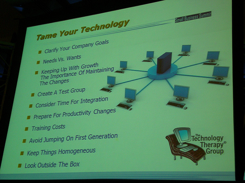 Jennifer Shaheen gave some good advice( see slide below) on how to plan for introducing new technologies to the small business office. Plan for time to train, plan during the slow season, try to get a expert to give some tips . She used the example of moving from office 2003 to Office 2007 where some of the Word tasks have different access methods.